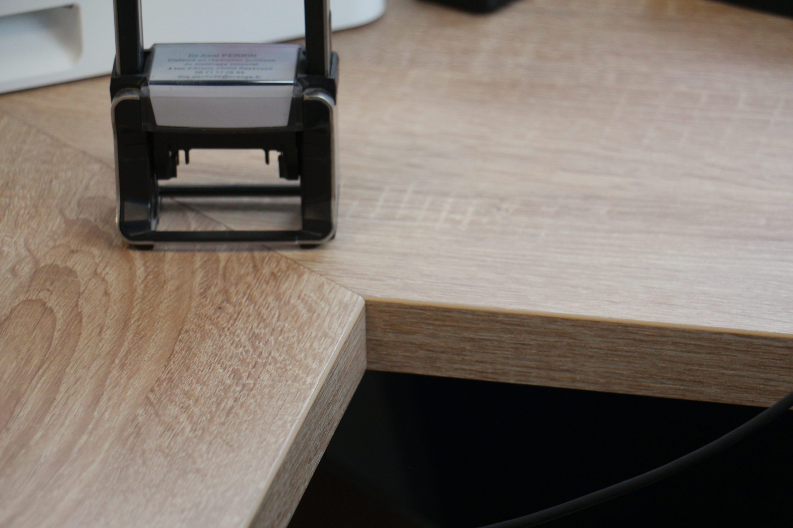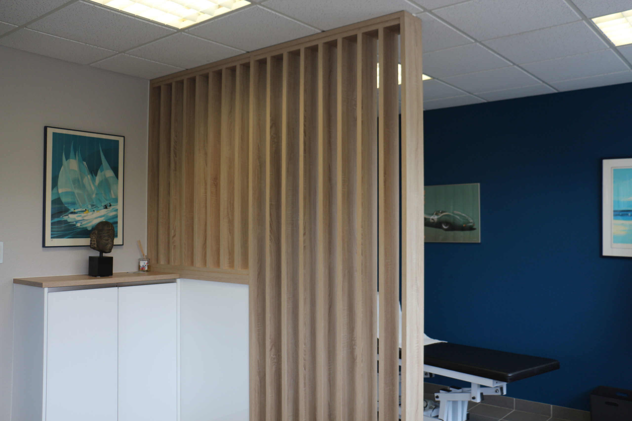 J’ai donc créé un mobilier entièrement sur mesure, du bureau d’angle aux placards, avec des façades blanches élégantes et surfaces en bois clair qui allient ergonomie et douceur visuelle. Le coup de coeur de mon client : la cloison ajourée en lames verticales structure subtilement l’espace sans le fermer, elle crée une transition douce entre les zones de travail et d’accueil en favorisant l’intimité et le bien-être des patients !