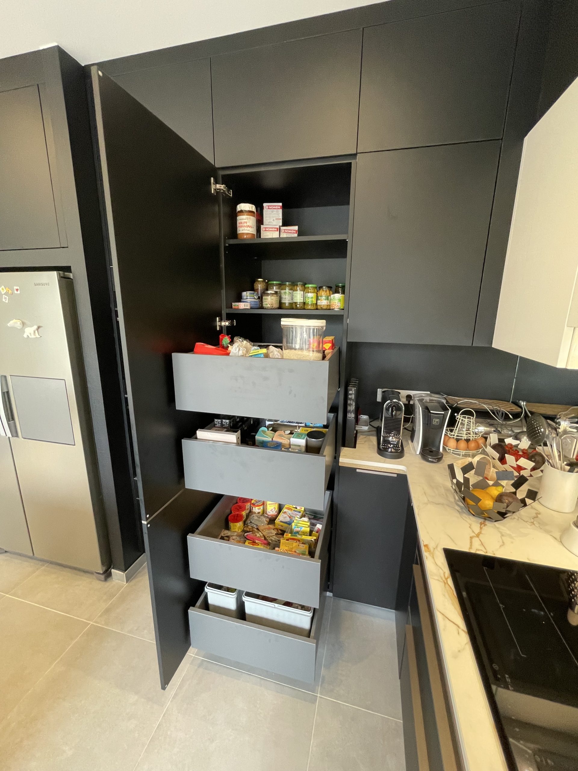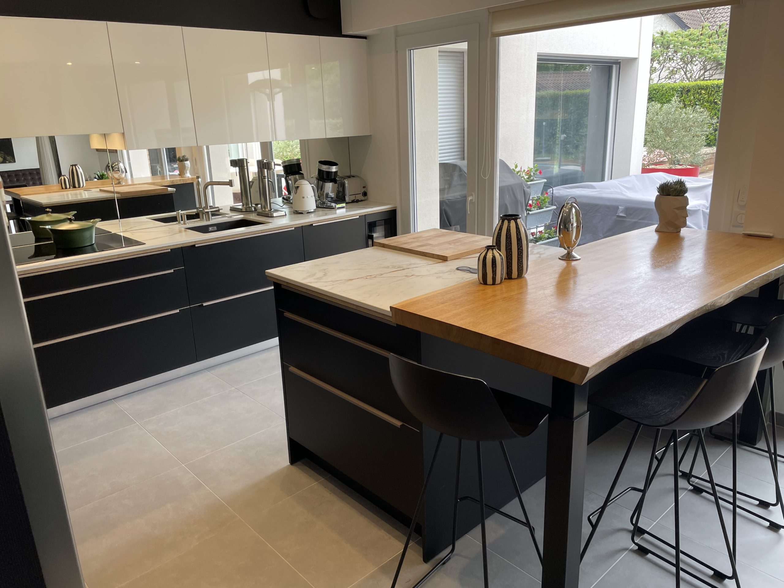 Mes clients souhaitaient conserver certains éléments de leur ancienne cuisine, tout en intégrant de nouvelles fonctionnalités et en réorganisant l’espace… Défi relevé ! L’ancienne table a été magnifiée et transformée en îlot central, mêlant bois massif et surface minérale pour créer un espace de convivialité.