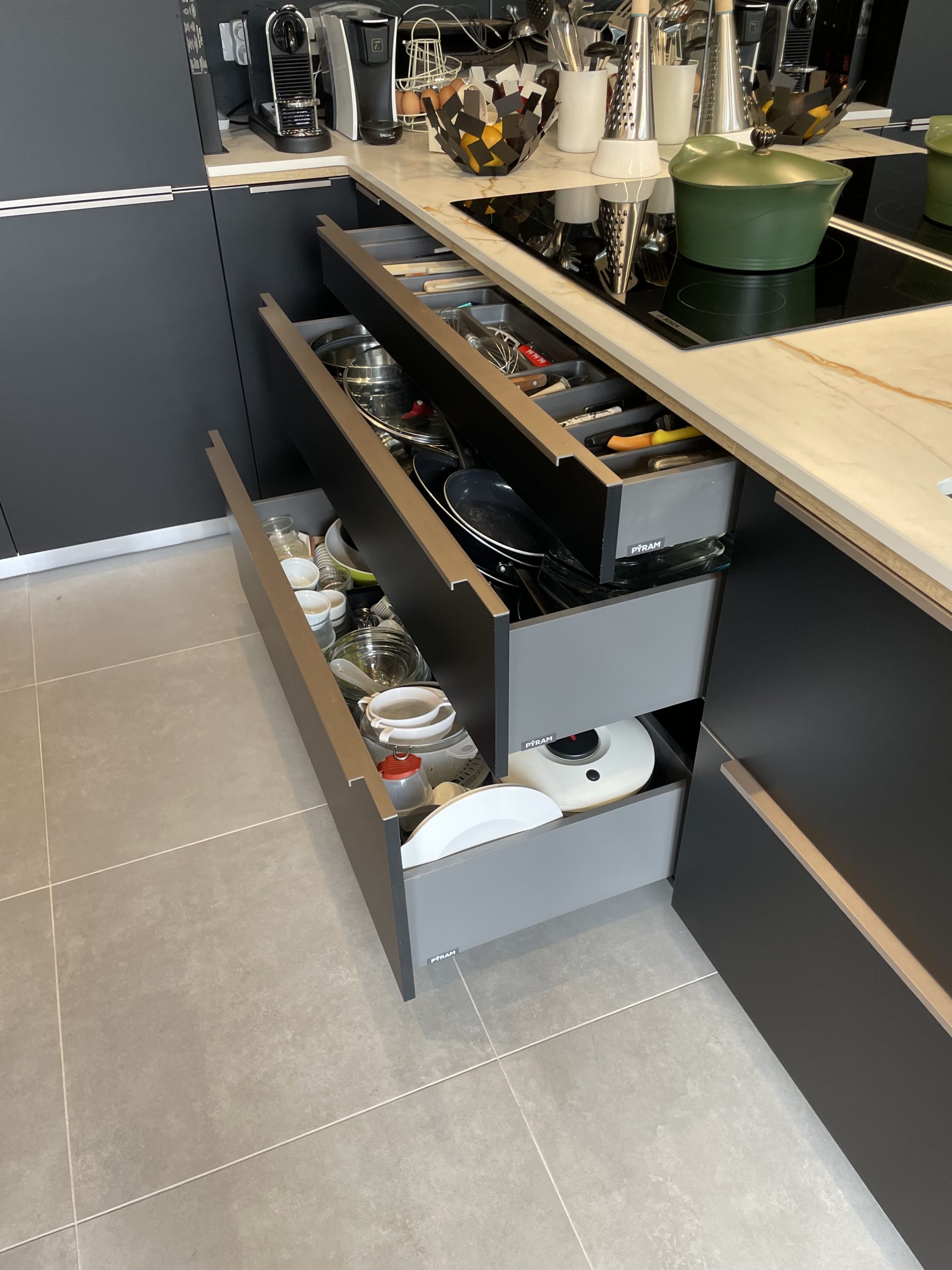 Dans cette cuisine, l’élégance est de mise ! Le contraste subtil des matières, les façades noires mates et ses finitions blanches lumineuses créent un espace de sérénité où il fait bon cuisiner.